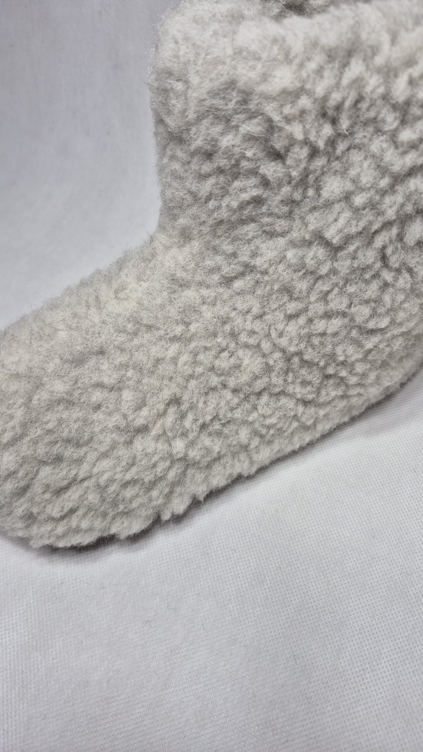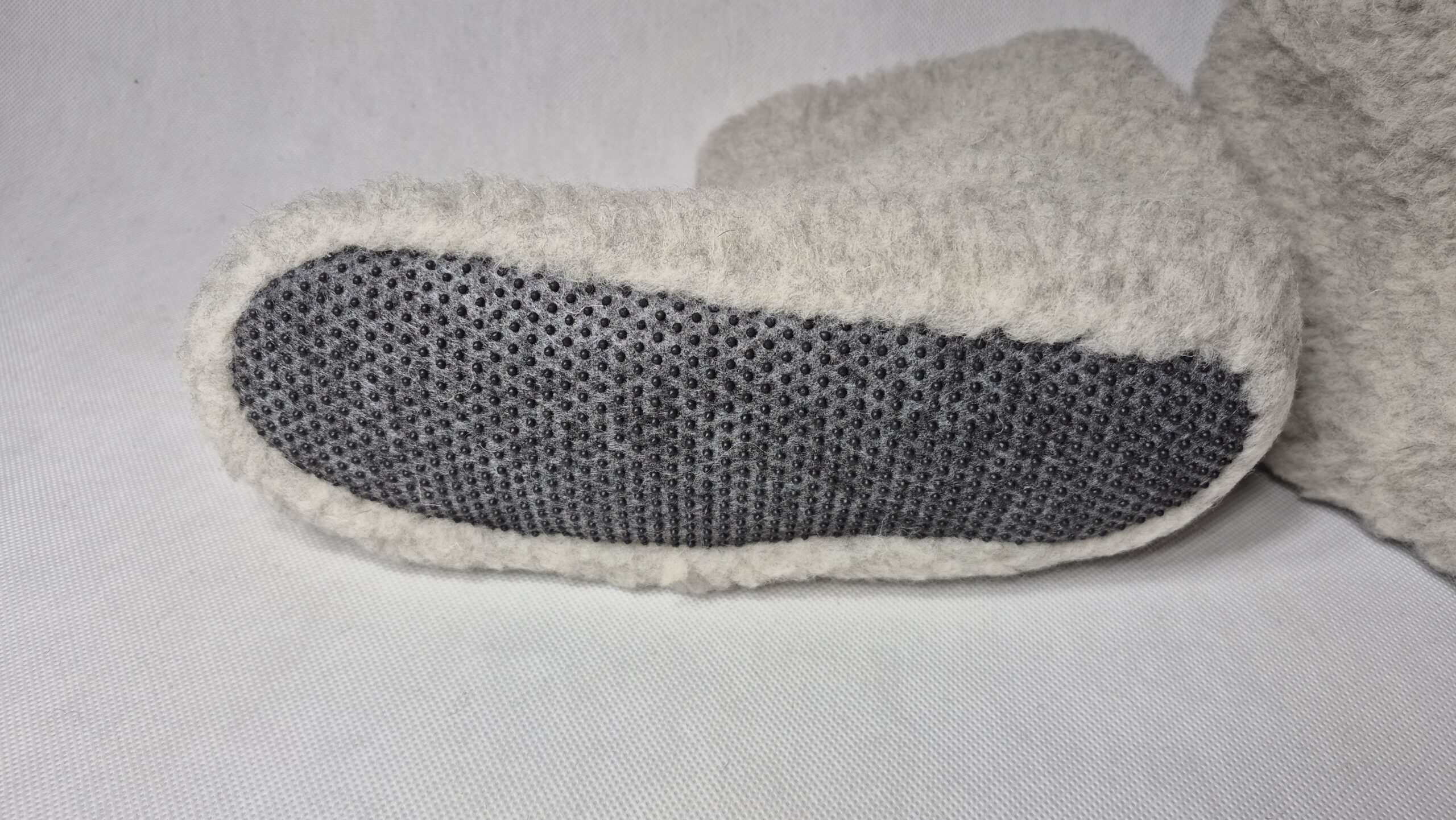 2. Czy spód kapci jest śliski? Nie. Aby zapewnić bezpieczeństwo na panelach i kafelkach, spód został wyposażony w antypoślizgowe wypustki (system ABS). To jedyny nie-wełniany element konstrukcji, dodany dla Twojej stabilności i wygody.